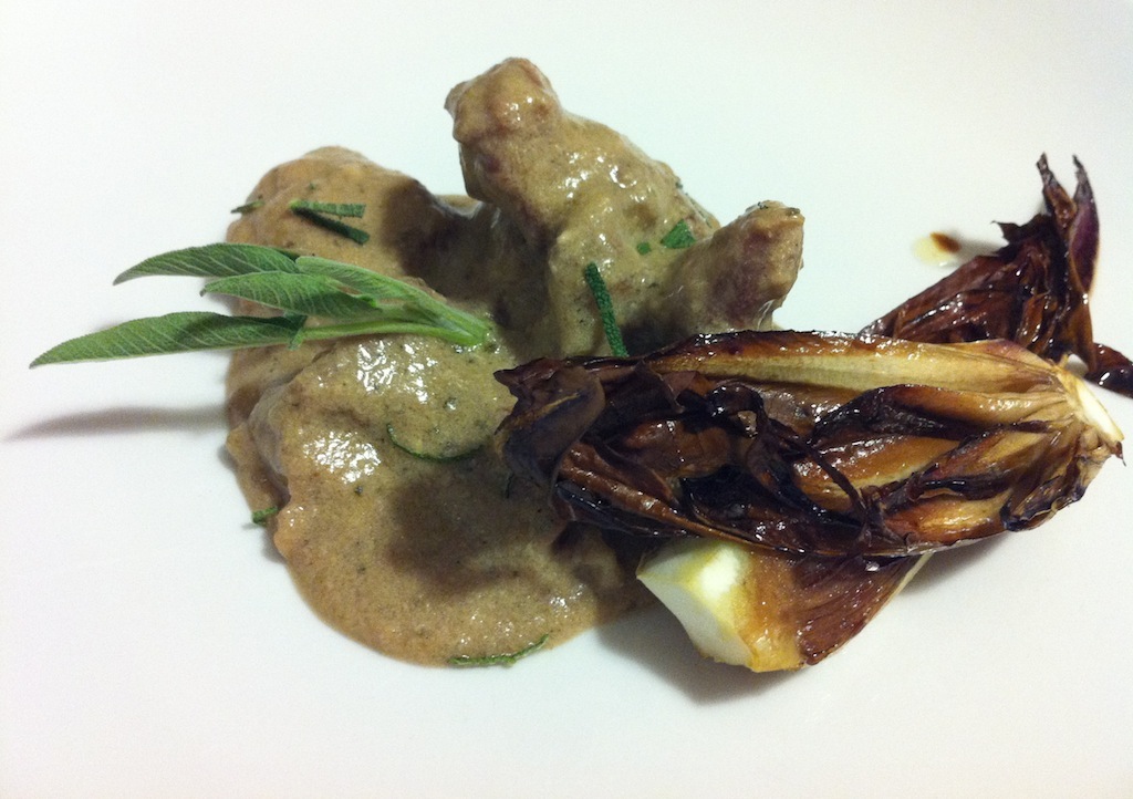 Nel mio mixer trito insieme farina, le foglie di salvia spezzettate e metà delle noci; passo quindi i bocconcini di vitello in questo composto. Li lascio rosolare nella padella con l’olio extravergine di oliva fino a quando avranno assunto un bel colore dorato. Unisco l’altra metà delle noci, tritate grossolanamente, il latte tiepido, il sale ed il pepe. Cucino lo spezzatino a fiamma bassa per circa 25 minuti e con il coperchio ma avendo cura di mescolarlo di tanto in tanto. Ottimo con una polentina morbida o del purè. Io, in questo caso, l’ho servito con del radicchio tardivo spadellato con dell’aceto balsamico (che io adoro)!