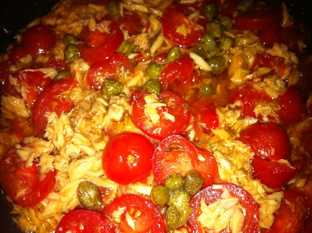 Per prima cosa metto l’acqua per lessare gli spaghetti sul fuoco poi mi accingo a preparare il sugo in una padella larga. Scaldo 4 cucchiai di olio d’oliva e ivi faccio rosolare l’aglio facendo attenzione a non bruciarlo e quando cotto lo elimino; aggiungo i filetti di sgombro sminuzzati e mentre lascio insaporire, taglio i pomodori a pezzetti, li aggiungo al sugo e lascio cuocere per altri 5 minuti, unisco quindi i capperi il peperoncino, regolo di sale e pepe. Quando gli spaghetti sono ancora al dente li scolo ( tengo un pò di acqua di cottura) e li faccio saltare insieme al sugo ed all’acqua di cottura. Spolvero con il prezzemolo et voilà un piatto semplice veloce e molto gustoso da servire in tavola!