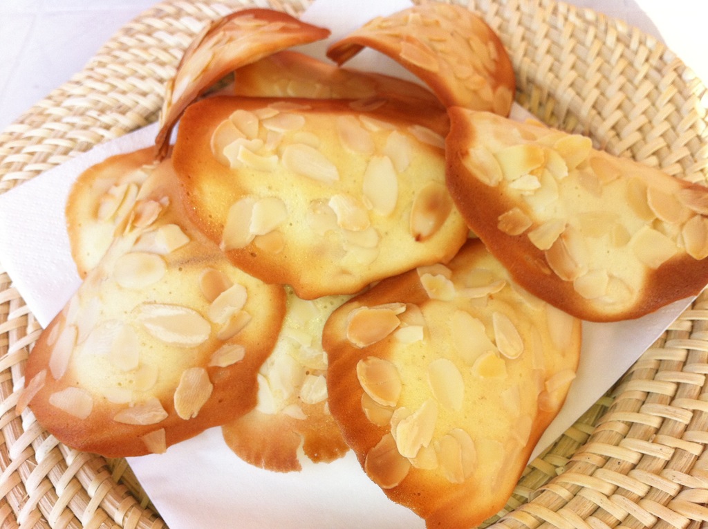 In una ciotola sbatto gli albumi insieme allo zucchero senza montarli poi unisco la farina un poco per volta amalgamando bene il tutto. Infine verso il burro fuso e le mandorle; mescolo accuratamente e ripongo il tutto in frigorifero per circa un’ora. Accendo il forno a 180°. Sulla teglia leggermente imburrata, dispongo, aiutandomi con un cucchiaino da caffè, dei mucchietti di pasta. Li allargo con il dorso del cucchiaino formando dei cerchi e avendo cura di distanziarli l’uno da l’altro. Decoro la superficie di ogni cialda con le mandorle quindi inforno per circa 5/6 minuti o fino a che il bordo risulterà di colore ambrato. Appena cotte le stacco dalla teglia aiutandomi con una spatola e le metto, ancora calde, sopra ad un mattarello facendole aderire in modo che formino delle ‘tuiles’ ricurve (la forma delle tegole). Per gustarle belle croccanti è meglio farle il giorno stesso in cui verranno consumate: la loro fragranza sarà eccellente.