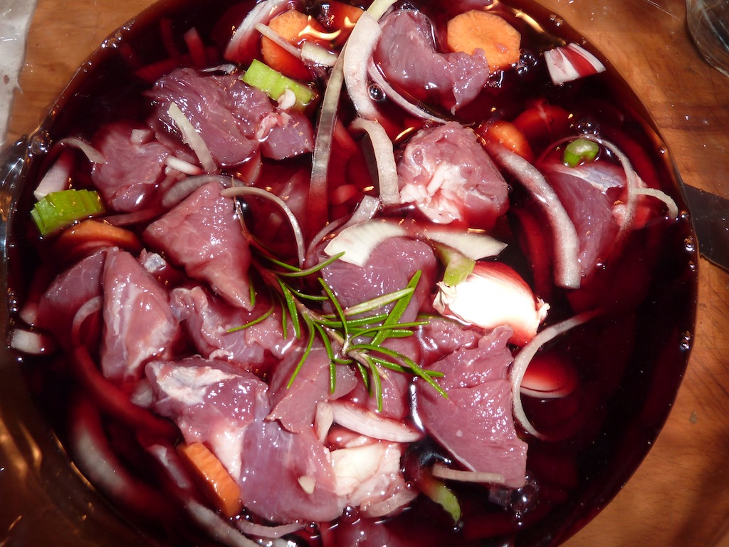 Scaldo l’olio ed il burro in una padella e poi a fuoco vivace faccio rosolare bene la carne precedente asciugata dalla marinata. Quando ben rosolata (deve evaporare completamente il liquido) aggiungo le verdure e lascio insaporire il tutto per circa 5 minuti. A questo punto bagno con il vino della marinata e, a fiamma vivace, faccio evaporare. Dopo circa 10 minuti copro e lascio cuocere a fiamma bassa per circa 3 ore, mescolando spesso e bagnando, se necessario, con il brodo precedentemente preparato.