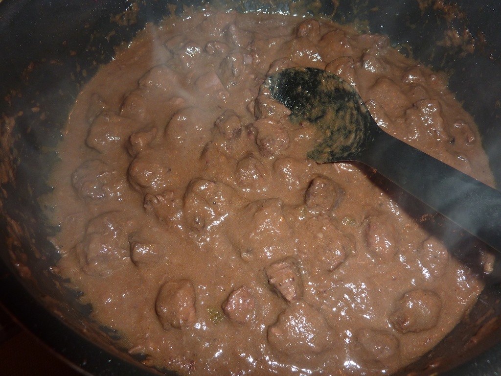Dopo di ciò tolgo la carne della padella e passo al setaccio le verdure avendo cura di togliere tutti gli aromi; alla fine risulterà un sughetto ben denso. Rimetto quindi la carne nella pentola, do una bella mescolata et voila…