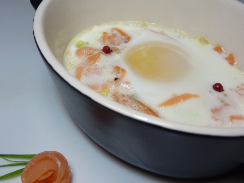 Per prima cosa ho pulito il porro eliminando la parte verde più dura, l’ho tagliato a rondelle e successivamente l’ho fatto appassire a fiamma moderata in padella con una noce di burro. Dopodiché ho imburrato leggermente le cocotte, quindi ho disposto sul fondo un letto di porro e il salmone affumicato tagliato a striscioline sottili. A questo punto rompo delicatamente le uova al centro di ogni cocotte e facendo attenzione a non rompere il tuorlo; aggiusto di sale e pepe ed unisco il cucchiaio di panna fresca. Inforno le cocotte a bagnomaria per 15 minuti a 180° finché l’albume si rapprende ma con il tuorlo che resta fluido. Servo accompagnando con dei crostini di pane tostato ed un ottimo vino bianco.