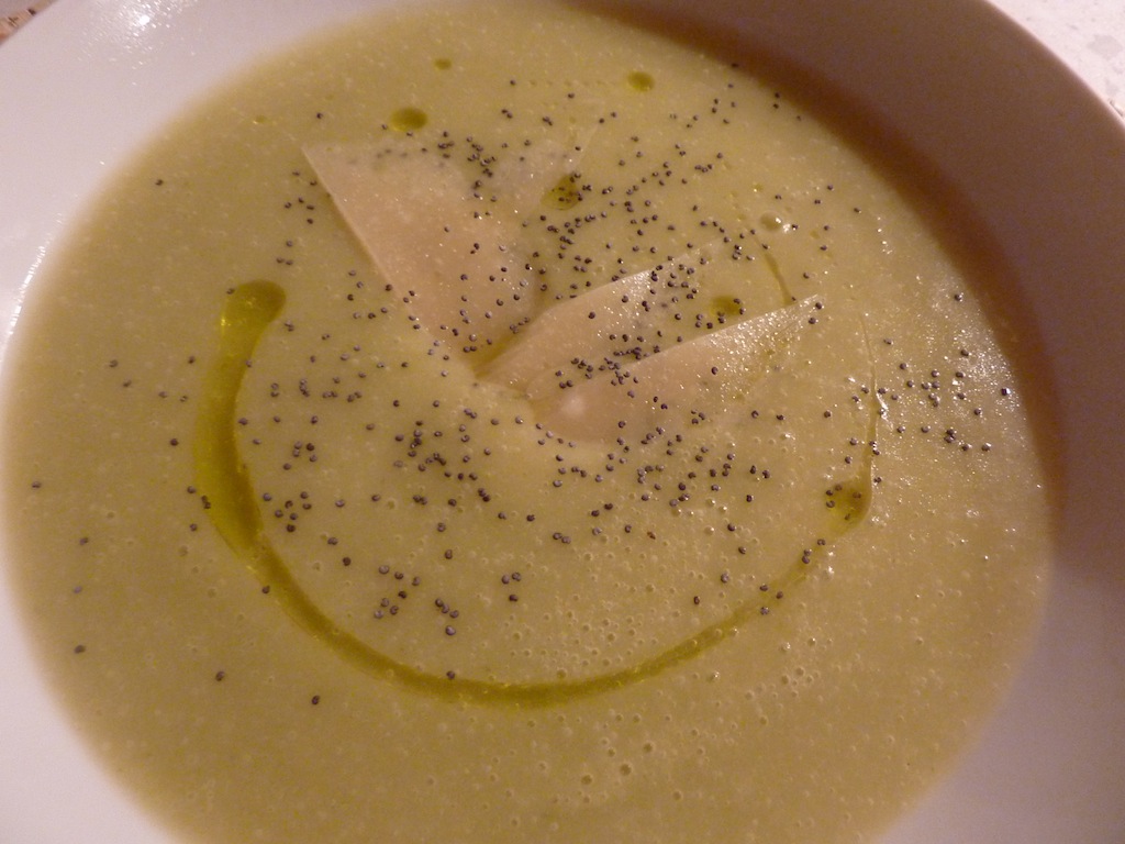 pulisco e taglio sottilmente i cipollotti, il porro e li faccio appassire in una padella con una noce di burro. Intanto taglio le patate a cubetti che unisco al soffritto, copro a filo con dell’acqua calda, aggiungo il sale e il pepe e lascio cuocere a fuoco basso fino a quando le patate saranno cotte. Frullo il tutto e aggiungo un po di acqua qualora la crema dovesse risultare troppo densa. Quando pronto servo subito con una spolverata di  semi di papavero, scaglie di parmigiano, un goccio di olio extra vergine di oliva e un crostino di pane ben croccante!