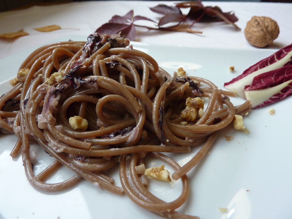Spaghetti al Pesto di Radicchio, Noci e Ricotta Affumicata
